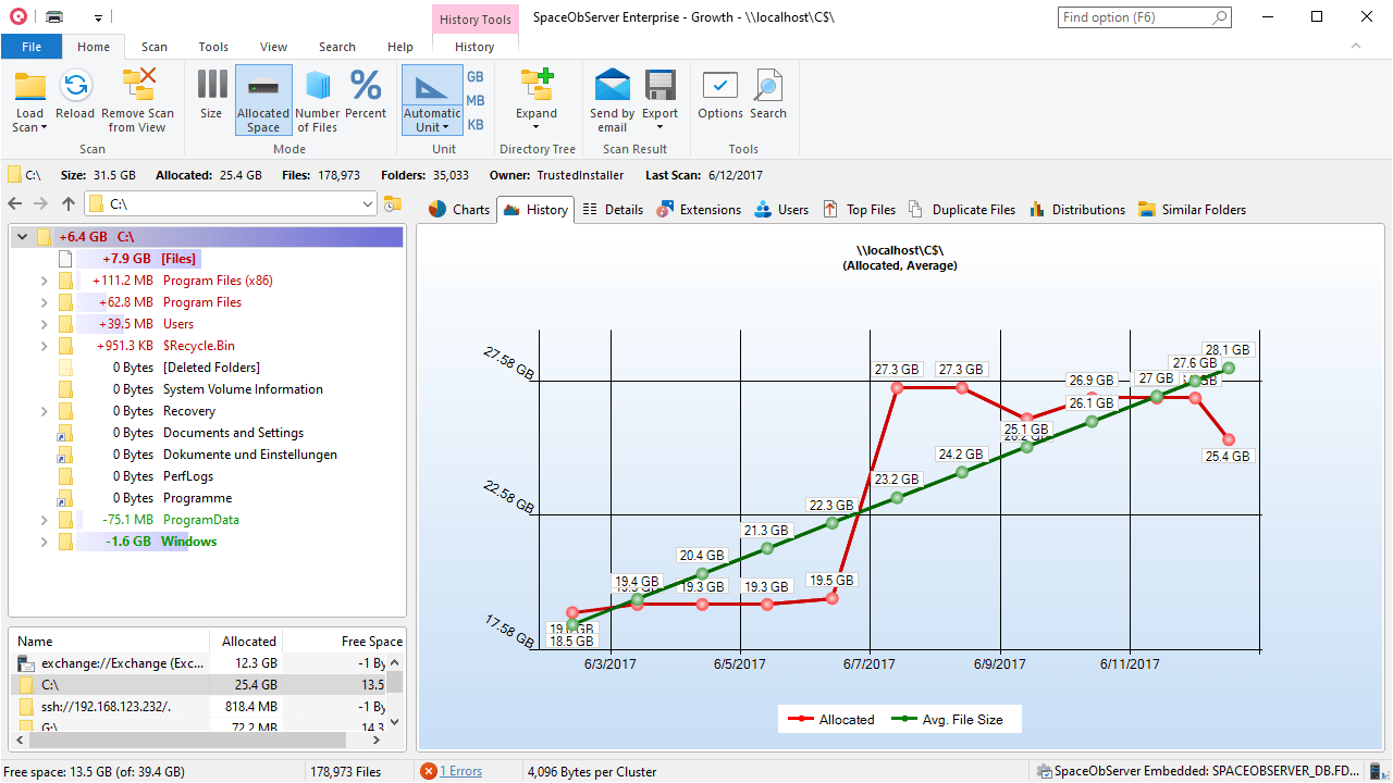 Der wichtigste Unterschied zwischen TreeSize und SpaceObServer ist der Hintergrunddienst, mit dem SpaceObServer Scans kontinuierlich durchführen kann.