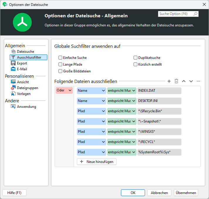 Die TreeSize Dateisuche macht überflüssige und sehr große Dateien ausfindig. Sie können hierbei die verschiedenen Suchtypen im Detail konfigurieren und zum Beispiel bestimmte Dateien oder Pfade von den Suchergebnissen ausschließen - zum Beispiel kürzlich geänderte Dateien.